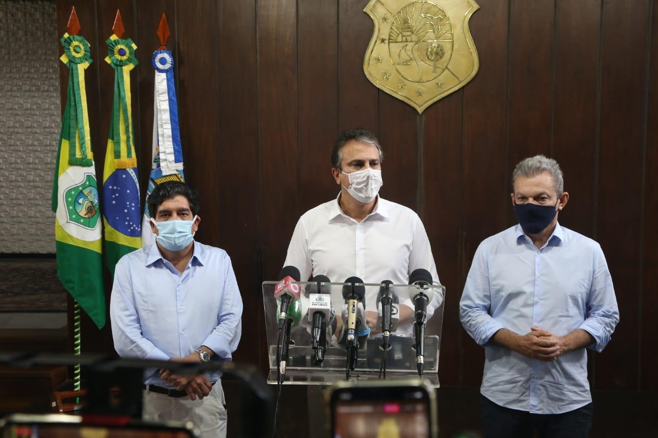 Dr. Cabeto, Camilo Santana e Sarto Nogueira em coletiva de imprensa na manhã desta quinta-feira