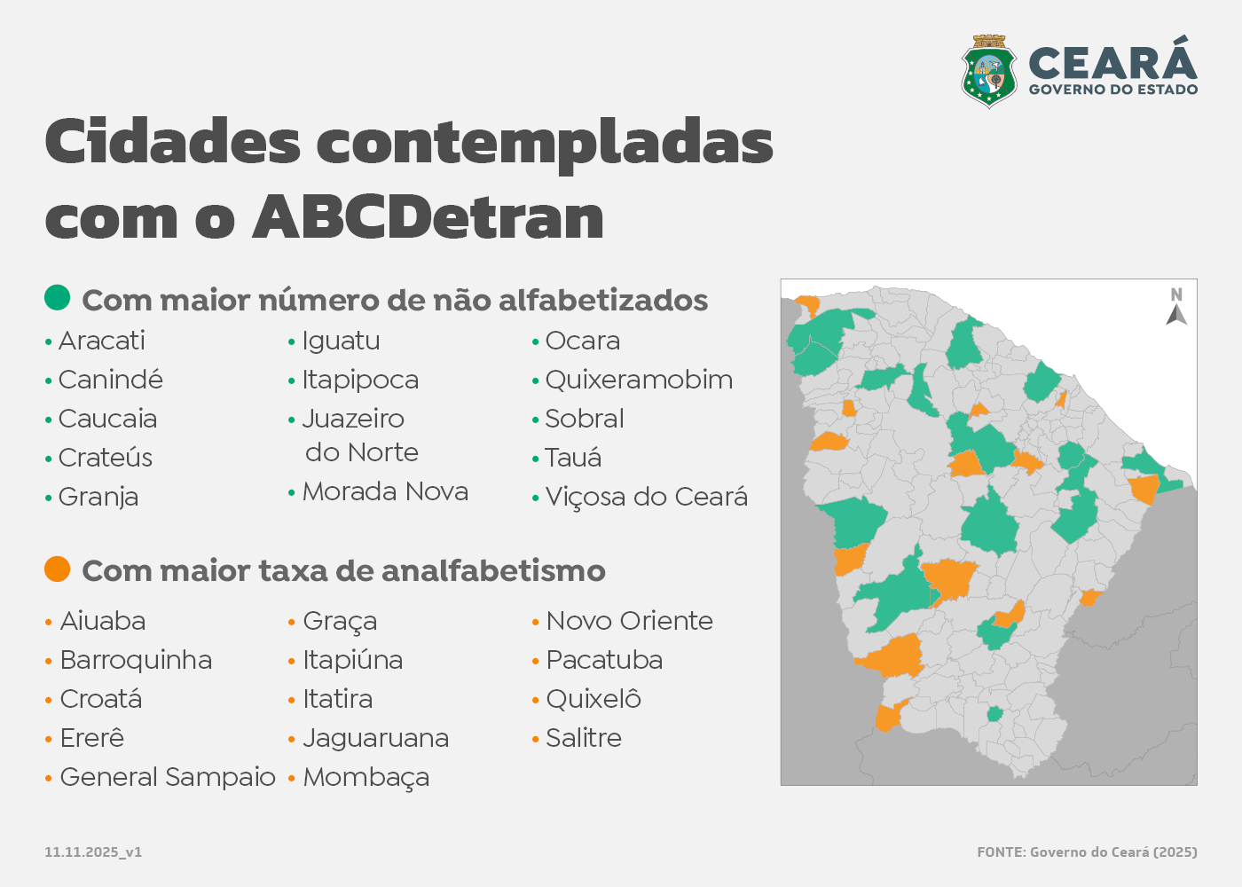 Os 29 municípios contemplados no ABCDetran foram escolhidos com base no número de pessoas não alfabetizadas e na taxa de analfabetismo de cada região. Além de Fortaleza, foram selecionados dois municípios de cada uma das 14 regiões administrativas do estado.