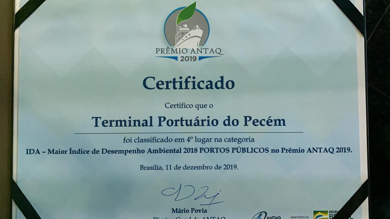 O Porto do Pecém foi um dos grandes premiados da noite na cerimônia de entrega do Prêmio Antaq 2019, realizada na Sede da Agência Nacional de Transportes Aquaviários, em Brasília. O terminal portuário localizado no litoral oeste do Ceará recebeu nada menos que três prêmios em reconhecimento aos avanços em inovação e desempenho ambiental.